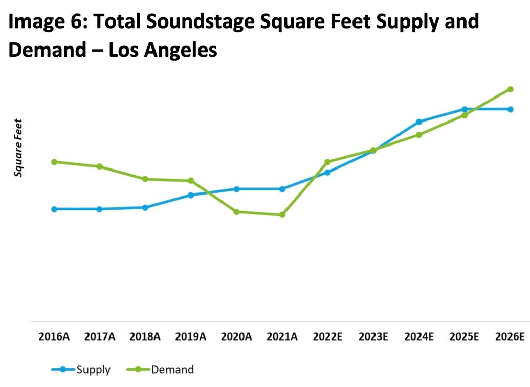 Half of those stages are fake. “The investment reflects the nearly nonstop demand for stages that has emerged in the streaming television age,” wrote the LA Times in 2023 about the Fox expansion, mirroring Deloitte’s optimism.